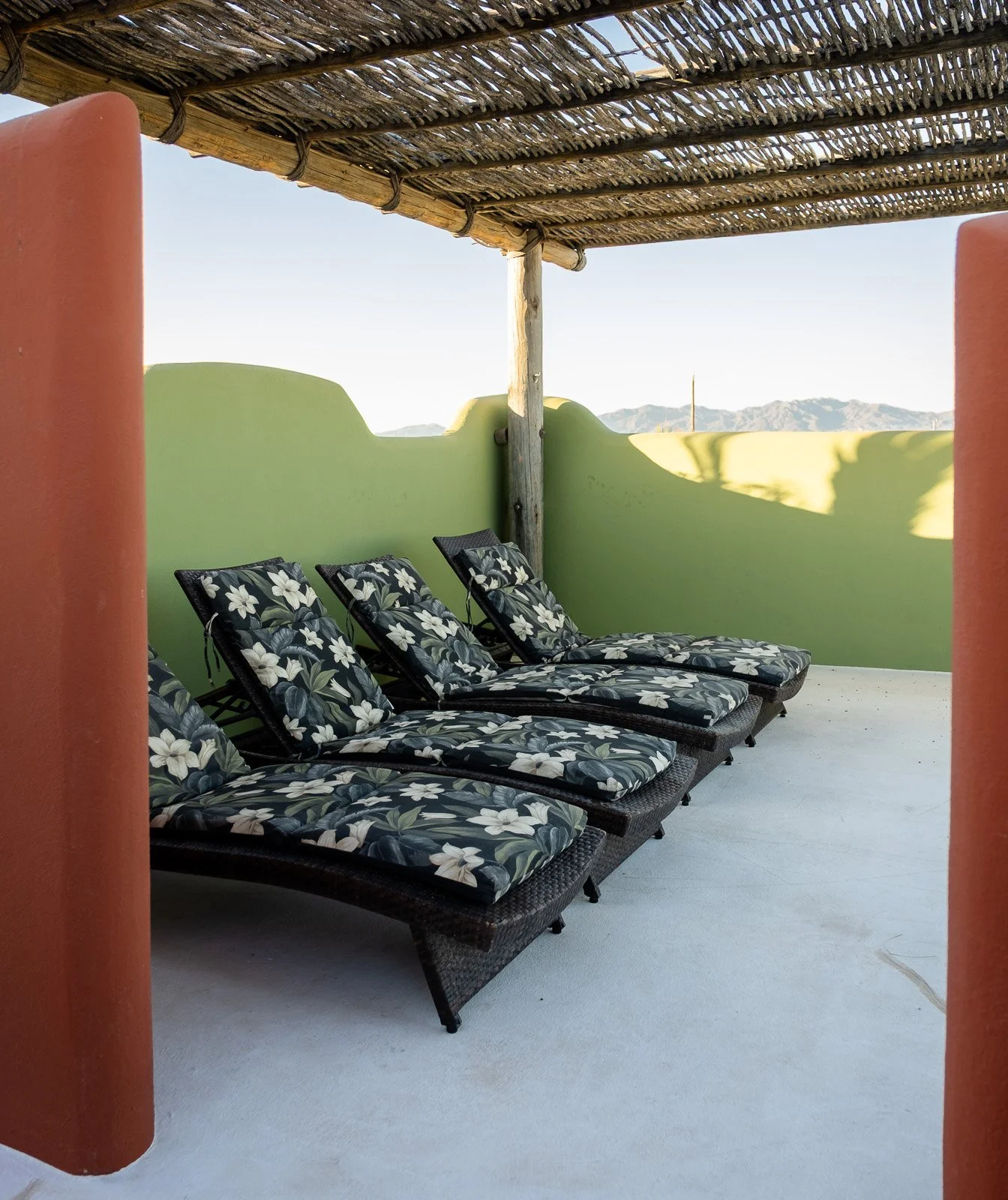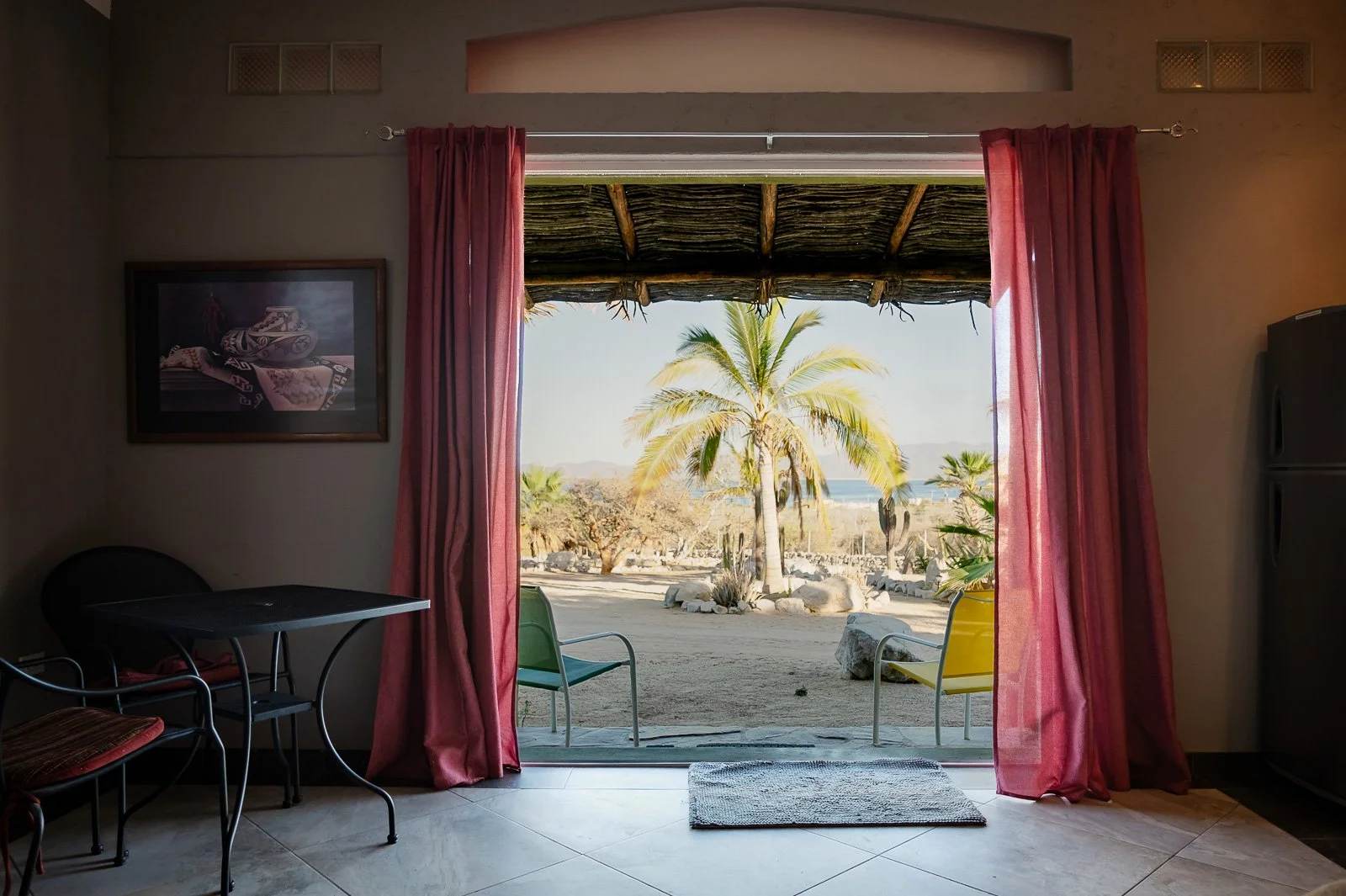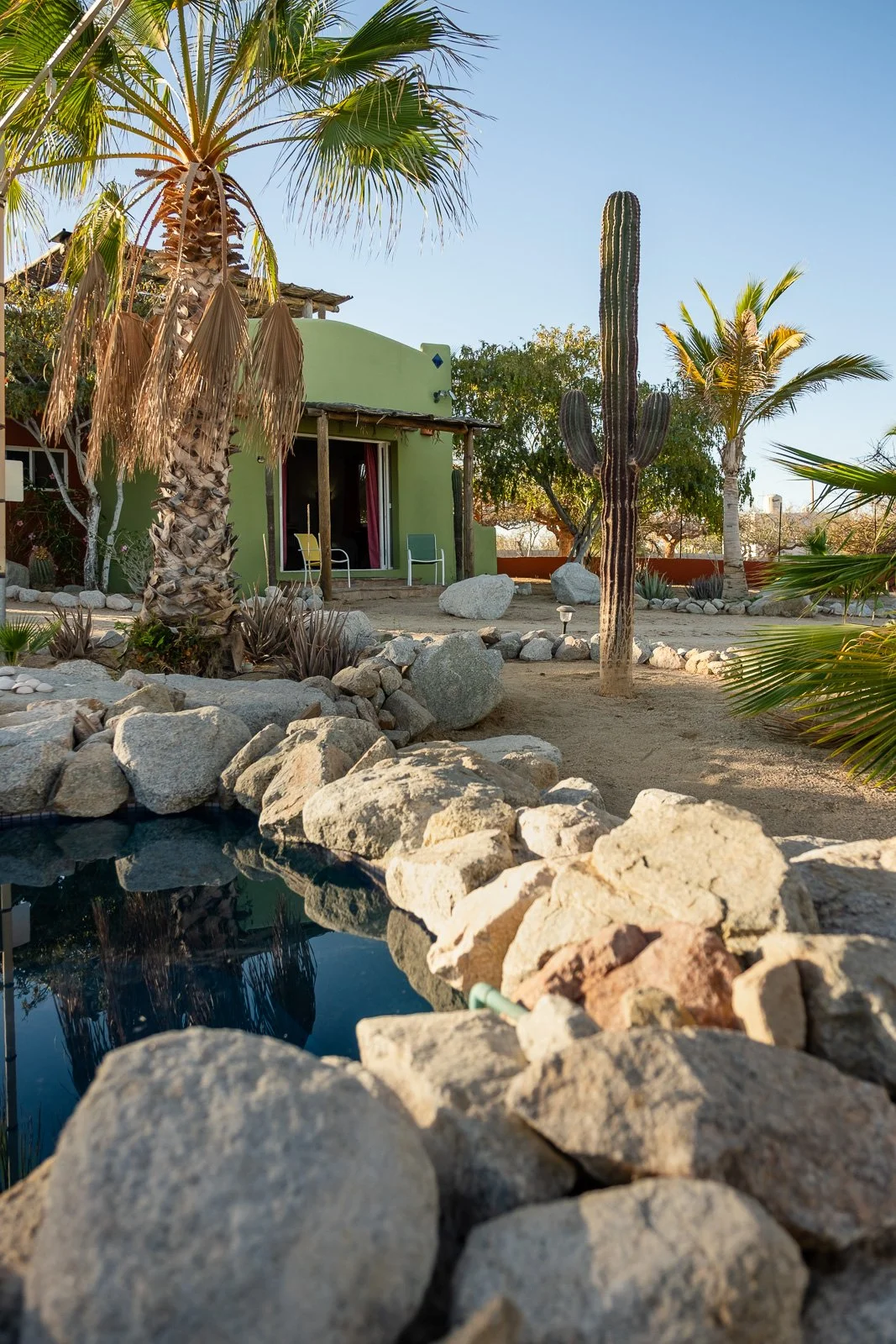 Private deluxe suite with beautiful panoramic views of La Ventana Bay and Cerralvo island. Enjoy our shared outdoor kitchen space and wood fired pizza oven with family and friends. Play bocce ball at our court and relax in the natural rock spa.